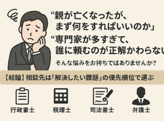 「親が亡くなったが、まず何をすればいいのか」「専門家が多すぎて、誰に頼むのが正解かわからない」 そんな悩みをお …
